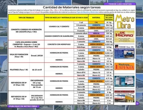 Cantidad de Materiales según tareas y Tipos de Trabajo.