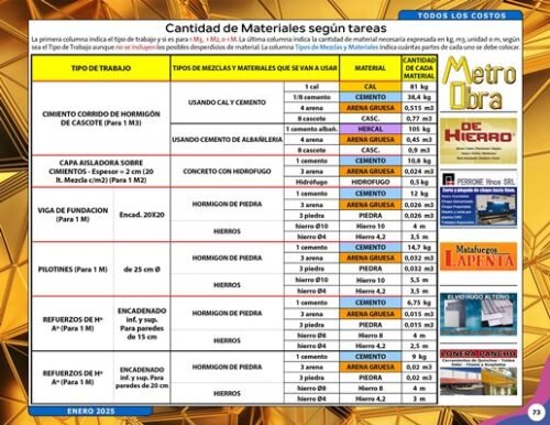 Cantidad de Materiales según tareas y Tipos de Trabajo.